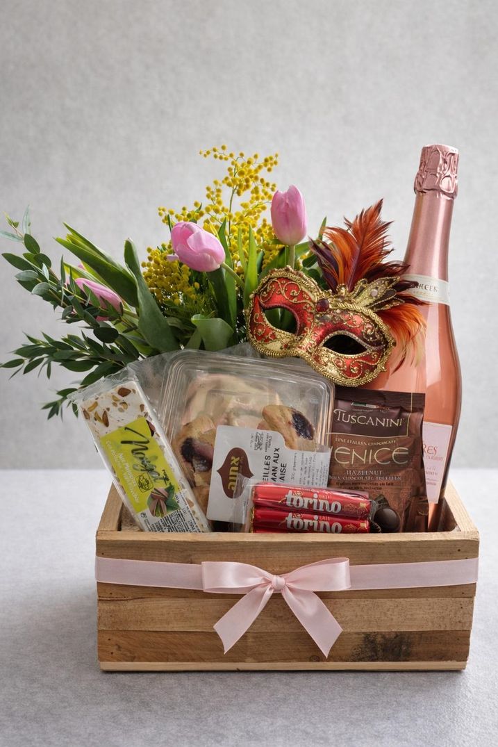 Un bouquet de fleurs fraiches de saison avec un masque de carnaval + une bouteille de Moscato + des oreilles d’Aman + des friandises (le tout cacher)